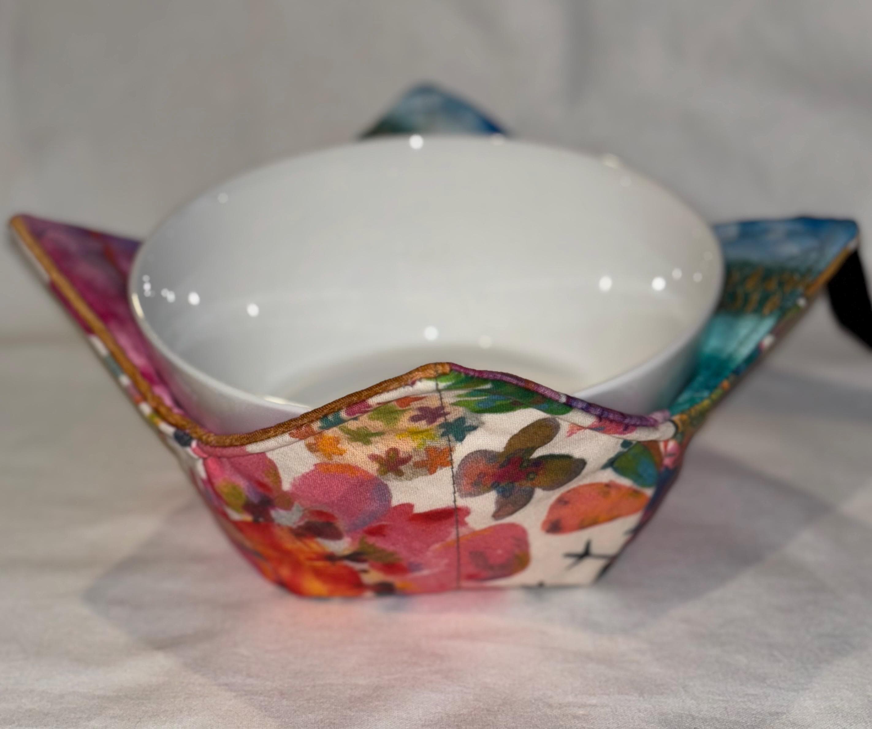 Heat protecting bowl cosies, Microwavable 100% cotton fabric, batting and thread. So handy, great gifts or just to use at home or work.