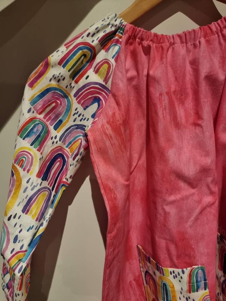 Little Darlings Art smocks have a plain body allowing for the option of personalization of your child’s name or surname on the chest area or a smaller name can be placed on or near the pocket. The plain back is closed, no buttons or zips just the elastic neck that goes on over their head. The long sleeves and two pockets are also cotton from a color co-ordinating patterned fabric.